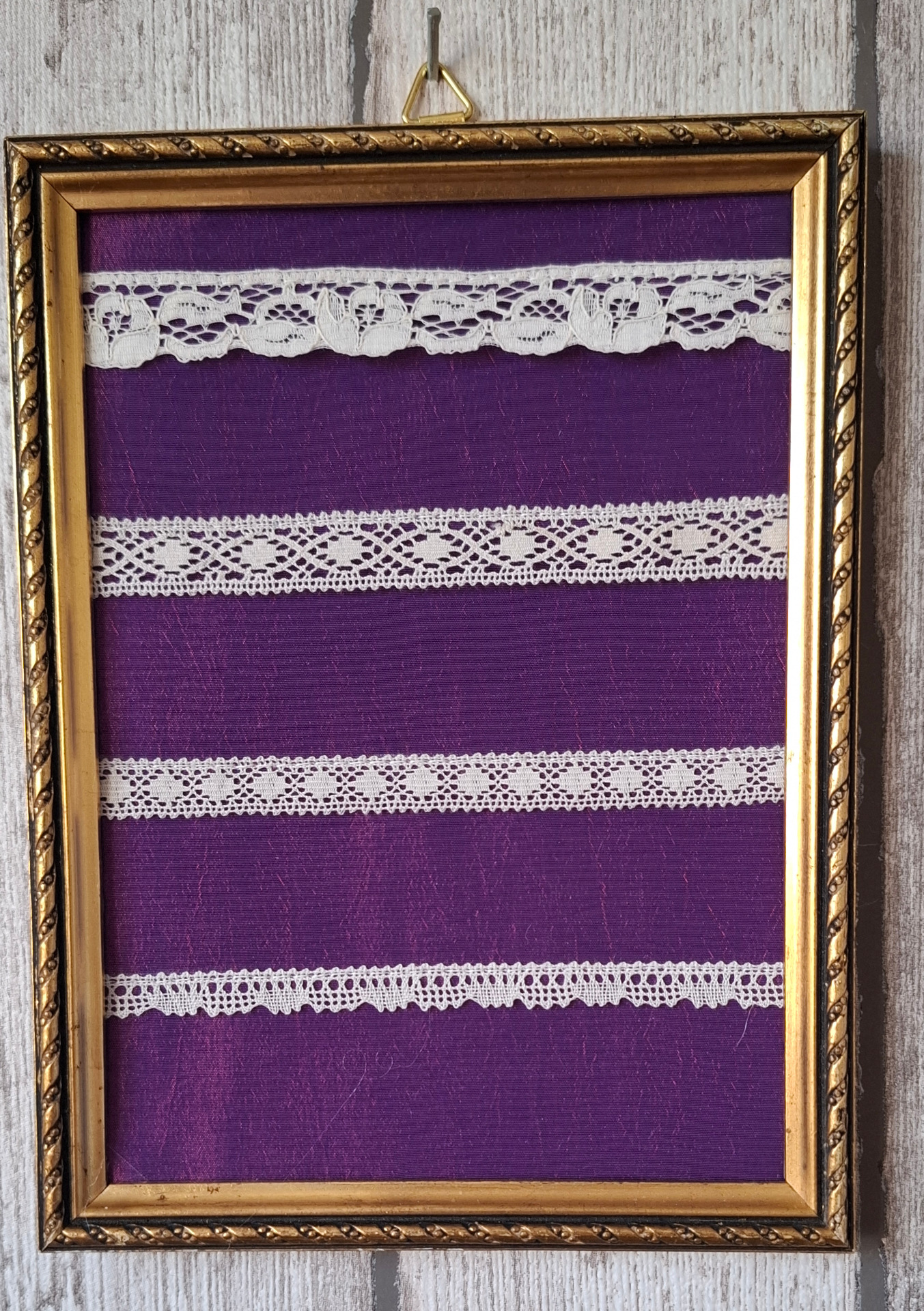 Liten tavla med spets att hänga örhängen på. Storlek ca 15x20 cm. Du hänger örhängena i nederkanten av spetsen. Tavlan kan du hänga på väggen.