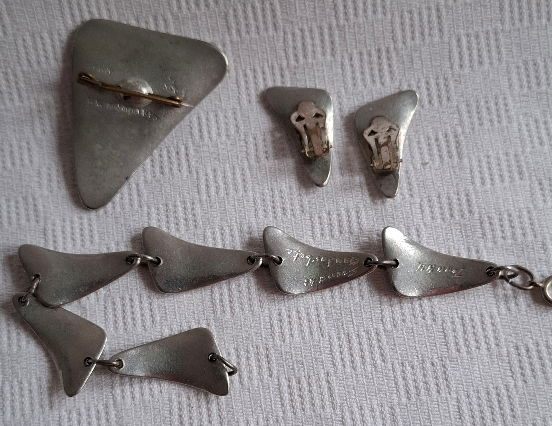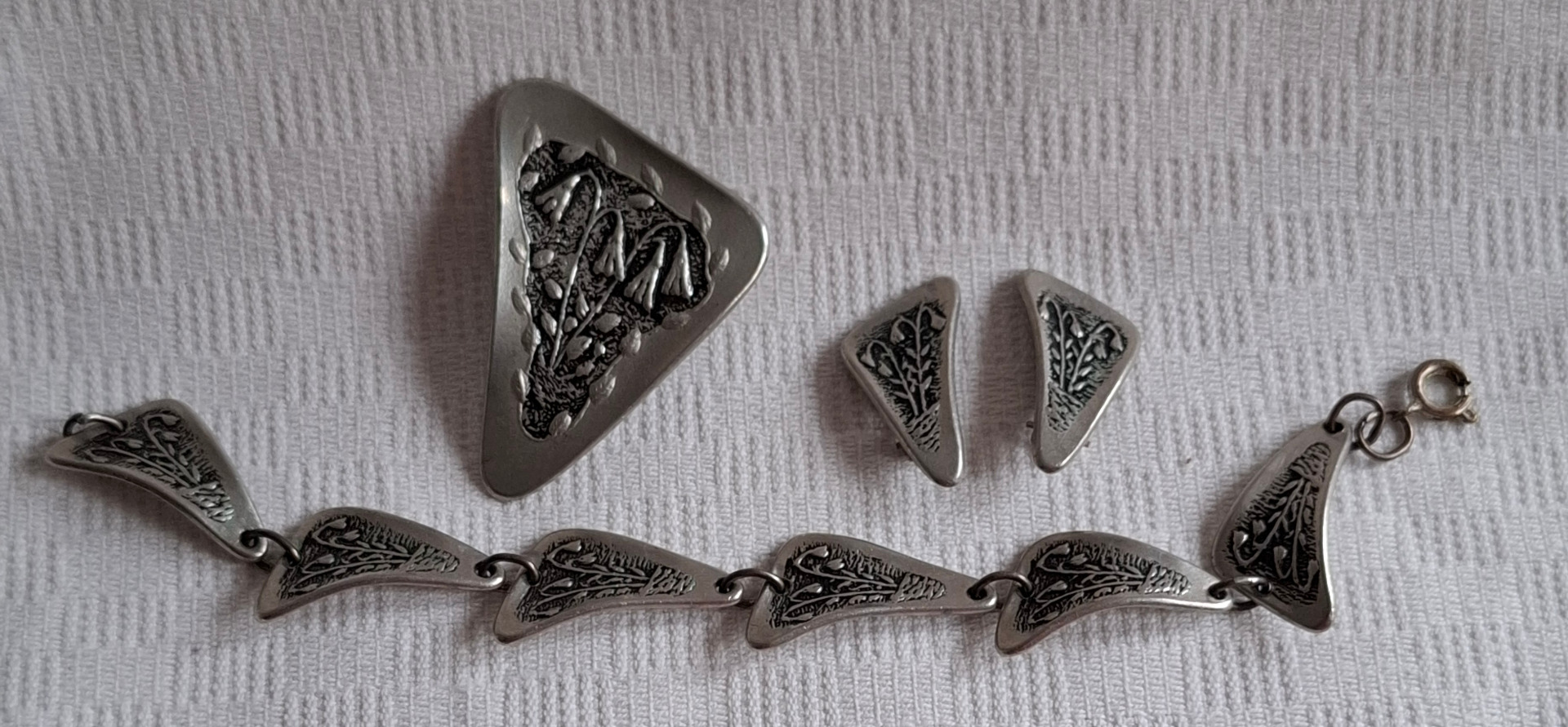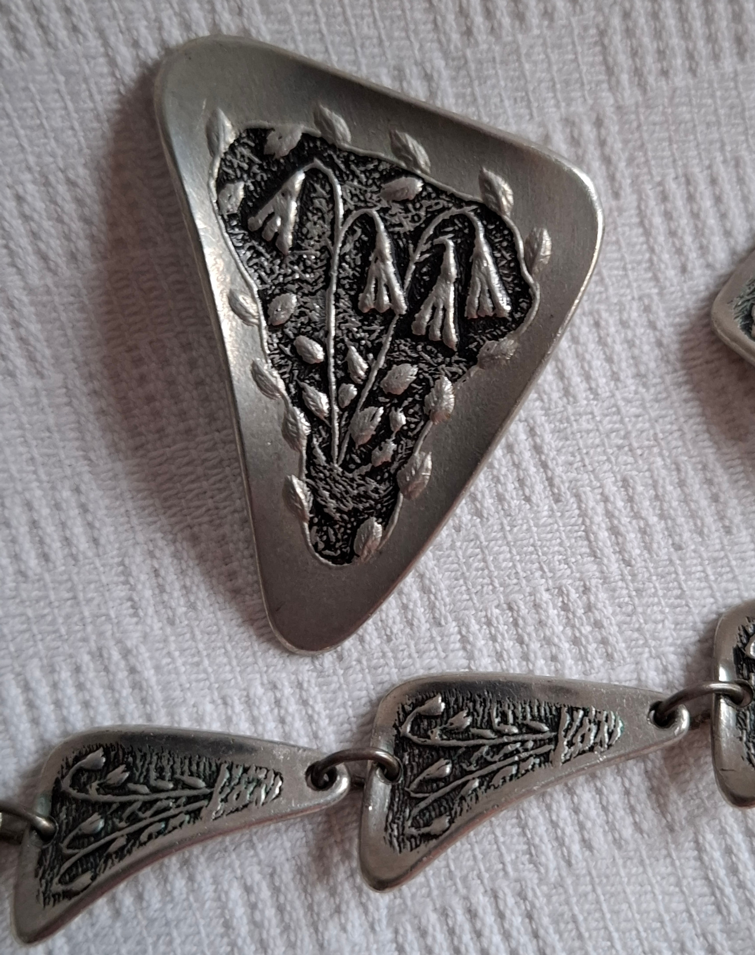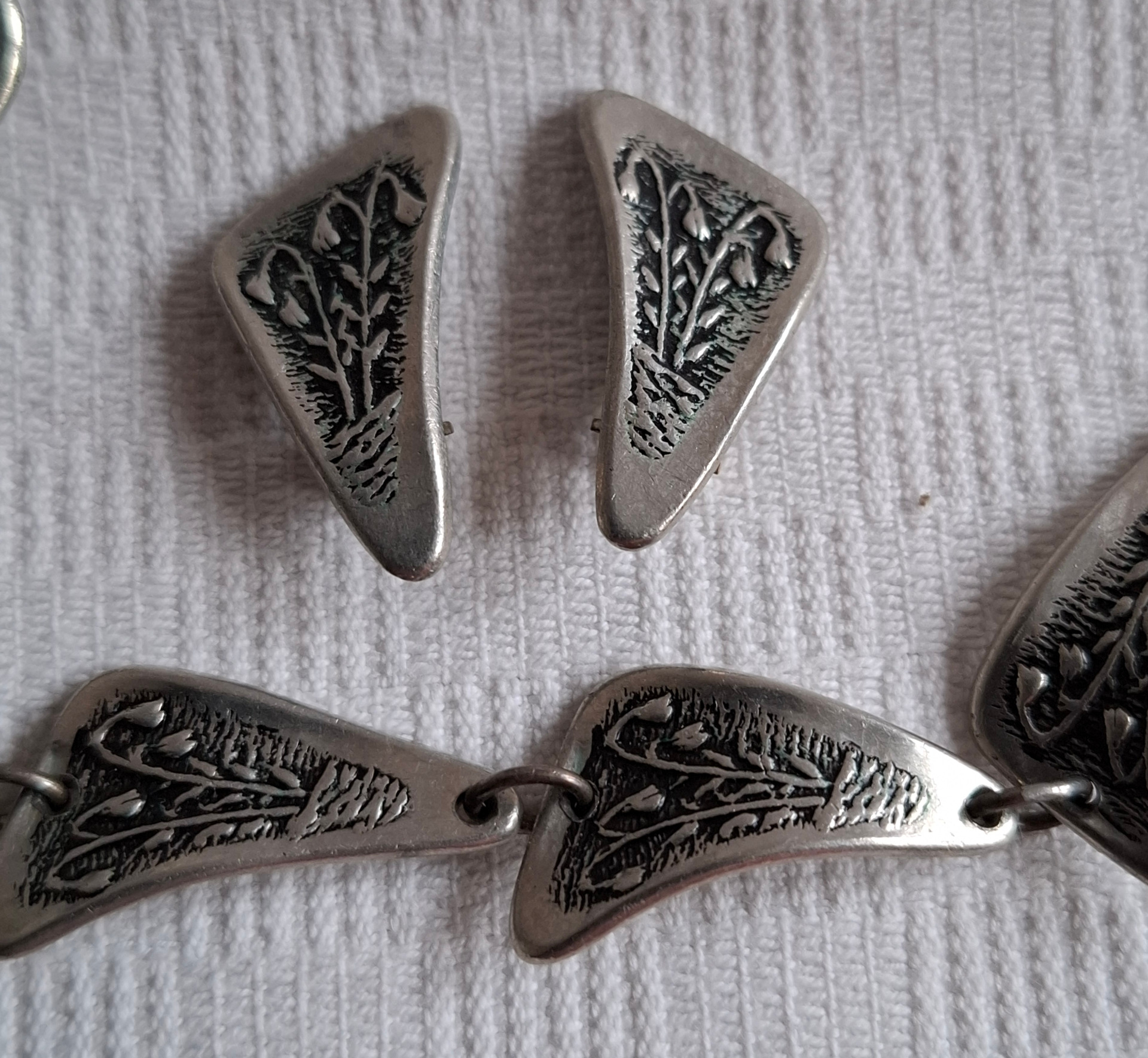 och smyckesetet är i tenn och svenskt hantverk. Smyckesetet är helt och i
