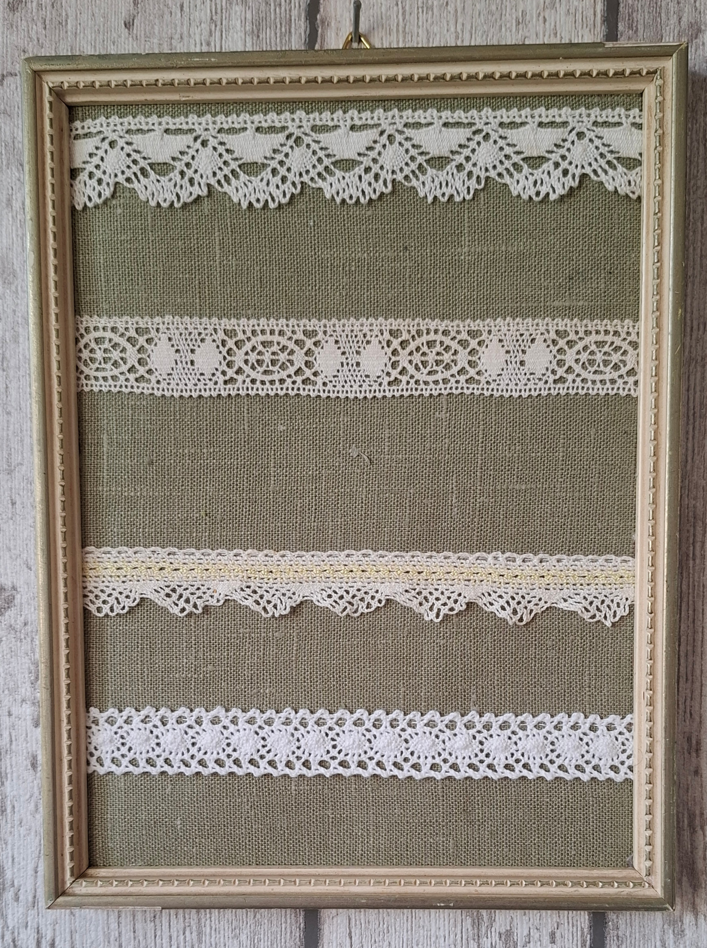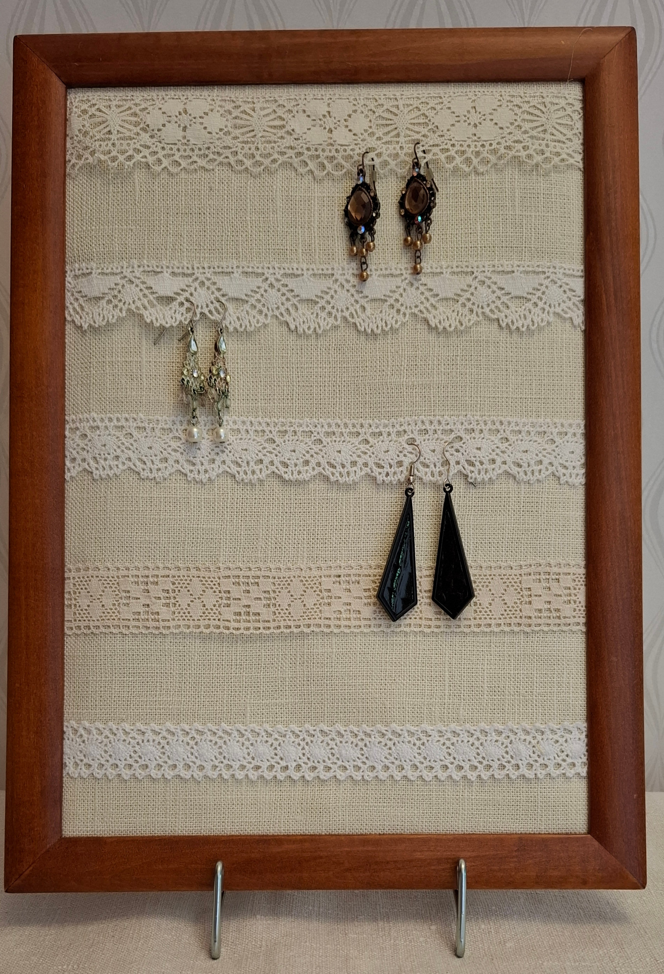 Liten tavla med spets att hänga örhängen på. Storlek ca 20x25 cm. Du hänger örhängena i nederkanten av spetsen. Tavlan kan du hänga på väggen. Ramen är gammal.