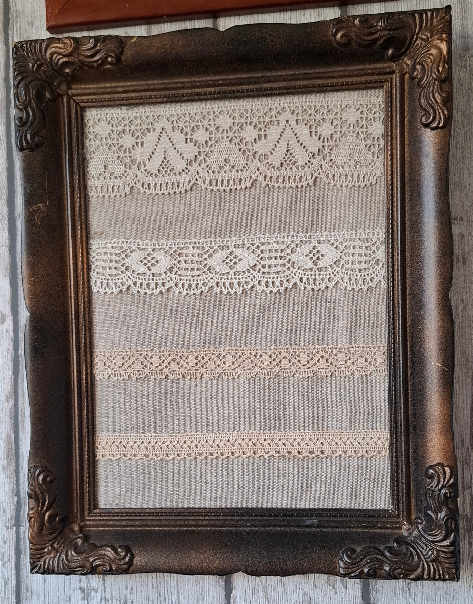 Större tavla med spets att hänga örhängen på. Storlek ca 28x35 cm. Du hänger örhängena i nederkanten av spetsen. Tavlan kan du hänga på väggen. Ramen är lite skadad i nederkant, Men bra skick, second hand.