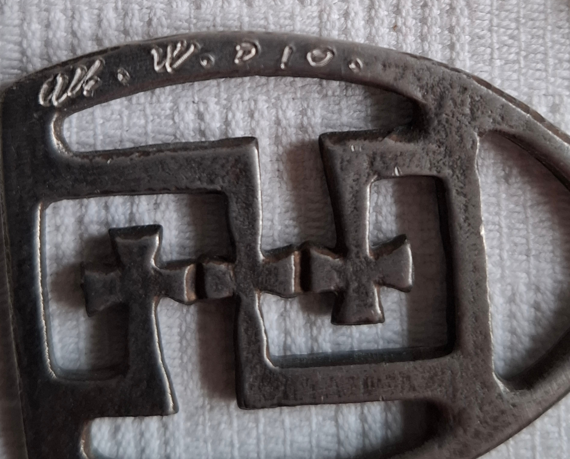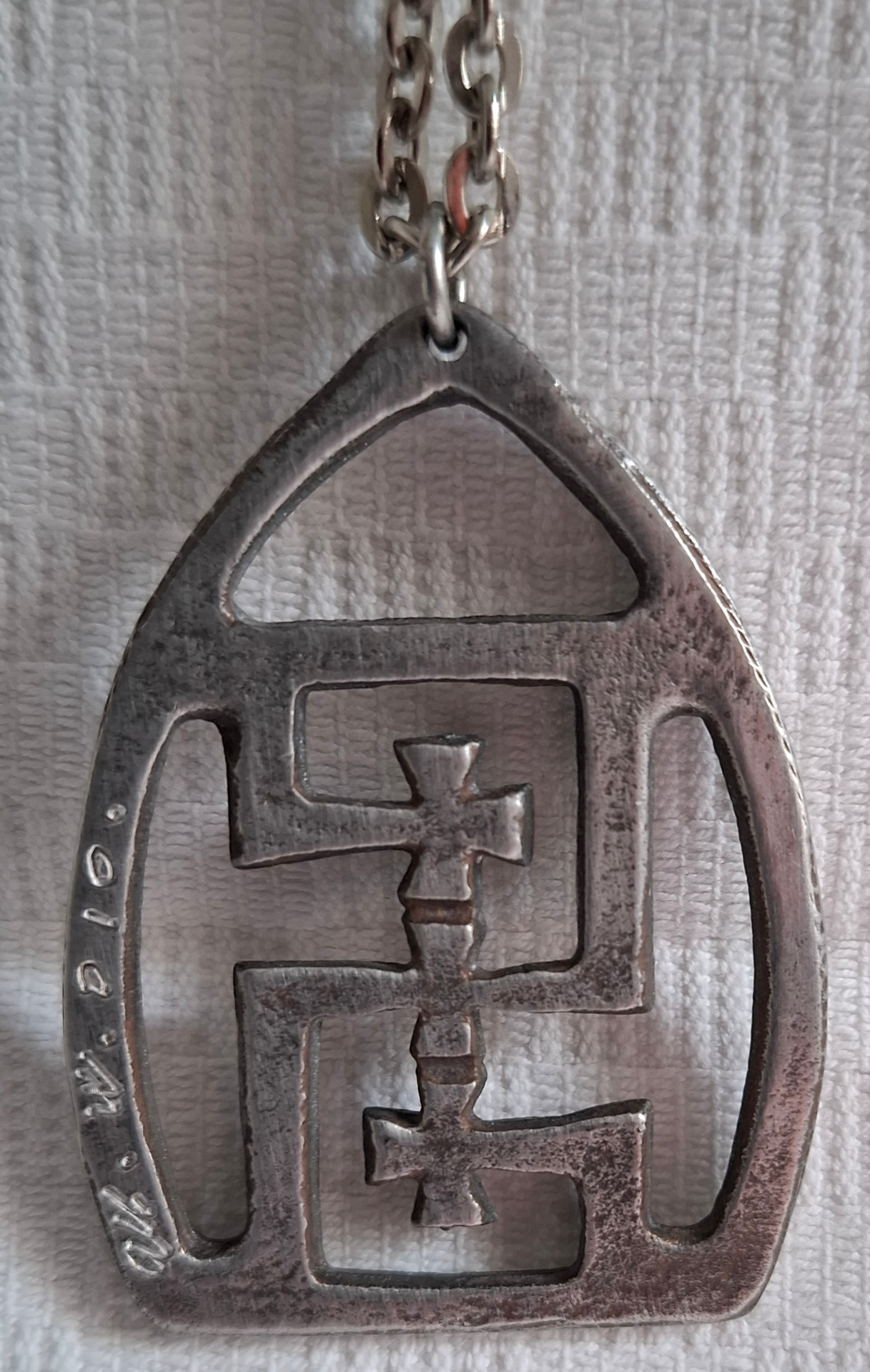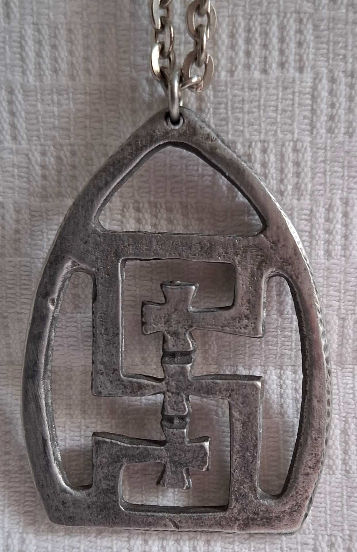 Tenn halsband med stämpel som jag inte kan tyda. Hänget är ca 5,5 x 4 cmKedjans längd är ca 70 cm. Halsbandet väger 36 gr. Mycket gott skick.